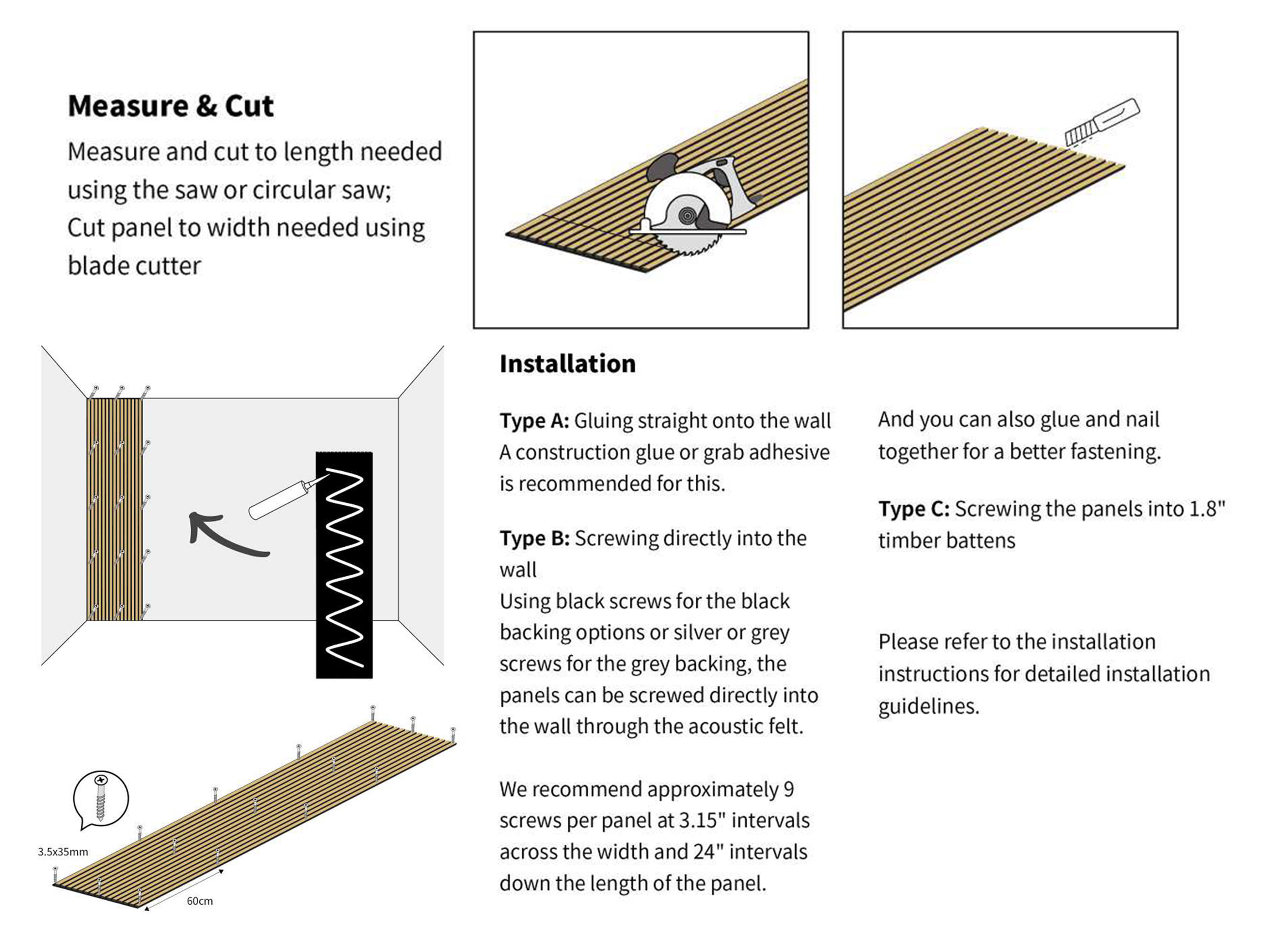 - Type B: Screwed directly into the wall (approx. 9 screws per panel recommended)