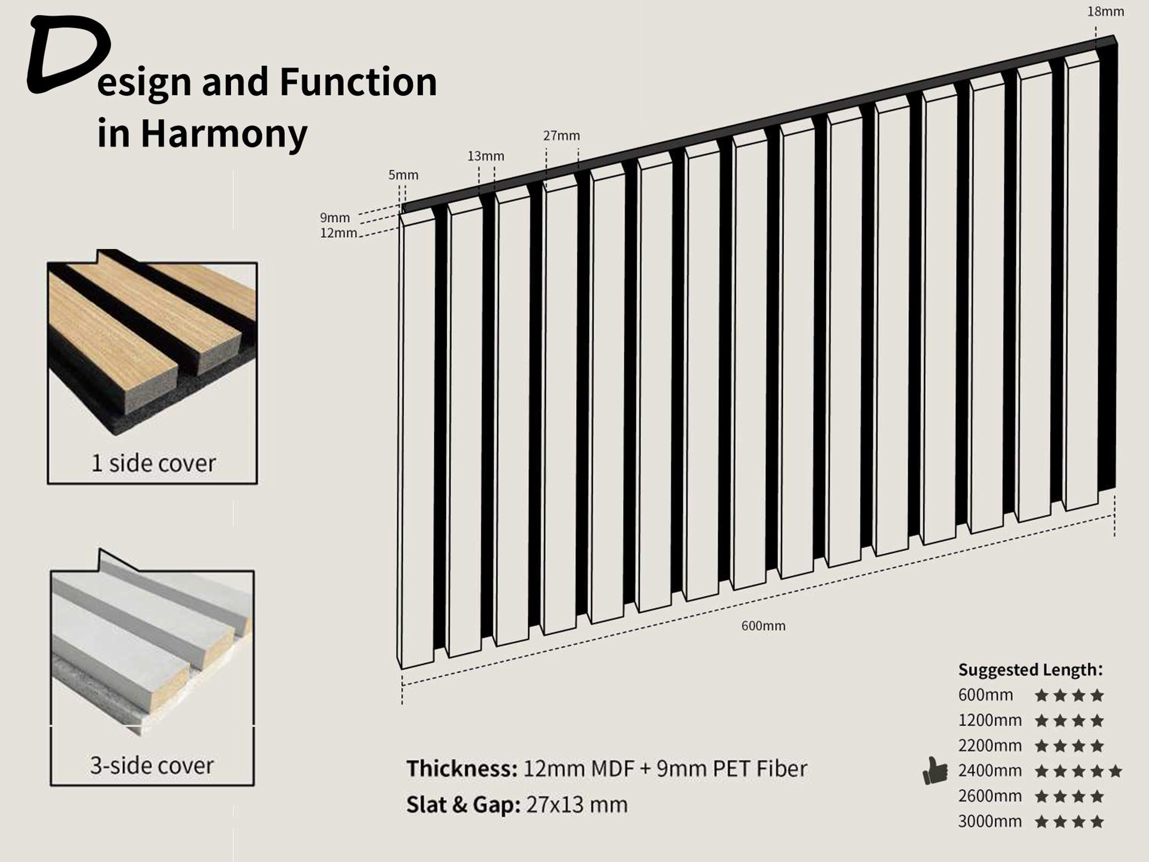 • Material Composition: 9mm PET felt backing for acoustic performance, bonded with 12mm black MDF for structural strength.